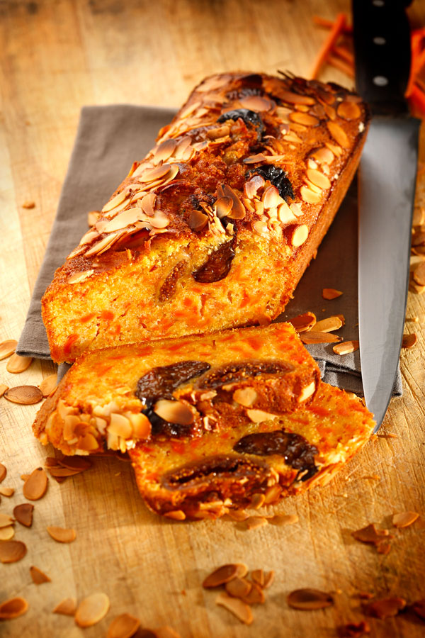 Pour le cake : mélanger la farine, la maïzena, le sel, la levure et le sucre, puis ajouter les œufs et bien fouetter le tout. Incorporez les carottes écrasées, l’huile d’olive, le beurre fondu et la vanille. Mélanger et verser dans un moule. Déposer les fruits secs sur la pâte en les enfonçant légèrement.