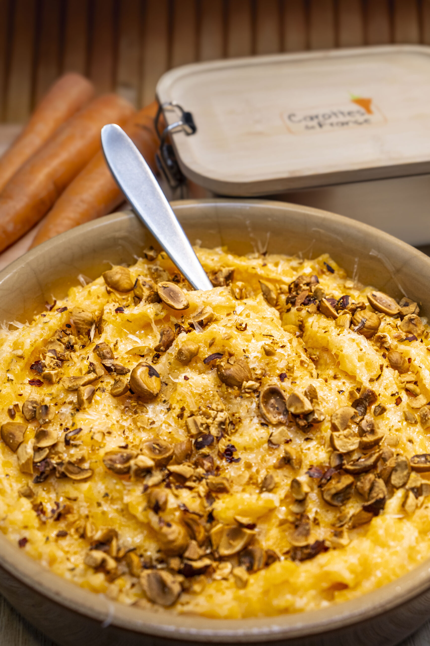 Purée de carottes au comté et noisettes grillées