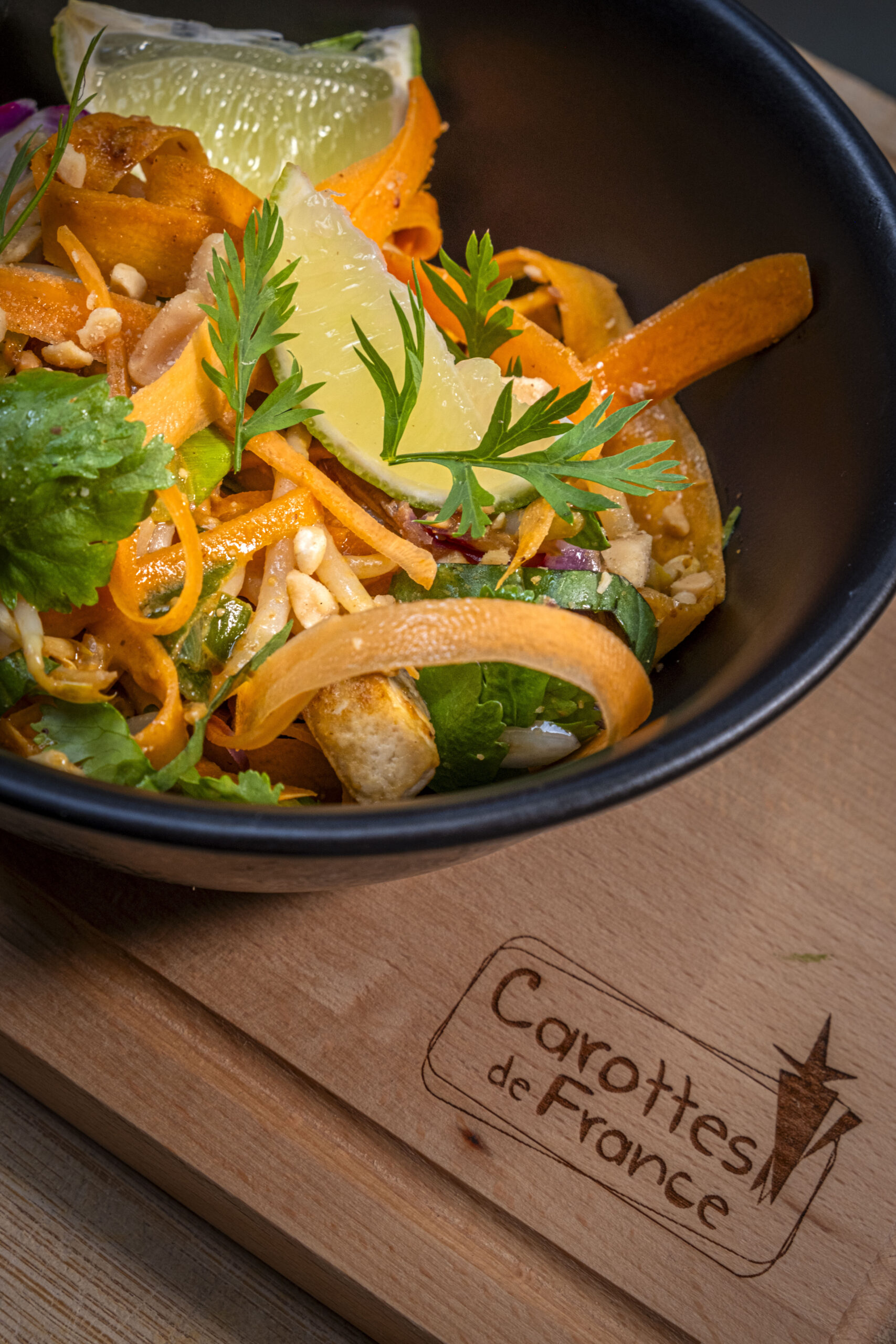 Dans un plat, déposer le mélange de carottes et le tofu, parsemer de basilic, de coriandre et de cacahuètes grillées.